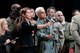 At Fidelio rehearsal, Assistant Stage Manager Thea Railey, standing in for a prison guard, listens to Greer Grimsley's roar as the angry Pizarro
