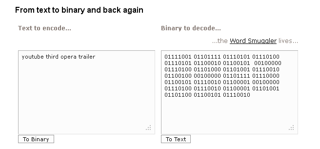 Translated, 01111001 01101111 01110101 01110100 01110101 01100010 01100101 00100000 01110100 01101000 01101001 01110010 01100100 00100000 01101111 01110000 01100101 01110010 01100001 00100000 01110100 01110010 01100001 01101001 01101100 01100101 01110010 is a very long way of saying: "youtube third opera trailer." And from reading that previous blog post, you would have known our third opera of the season is La Cenerentola (also known as Cinderella). And, by the way, we still have five more performances of this fantastic opera left...