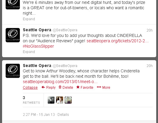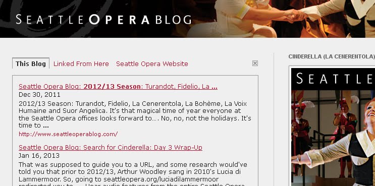 Once there, you would have seen the following comment: "First Turandot, then Fidelio, now Cinderella, with Bohème and Voix Humaine/Suor Angelica upcoming. Catch the remainder of the 2012/13 season—if you’re fast enough: SeattleOpera2013@gmail.com."