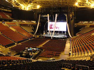 The rake was so steep! I remember asking for ski poles, because it seemed like a very sharp slope to me. That was the first show in the Mercer Arena, and our dressing rooms...well, let’s just say it was a different situation, with curtains instead of doors...it was fine. I remember my hair was dyed dark black and spikey.